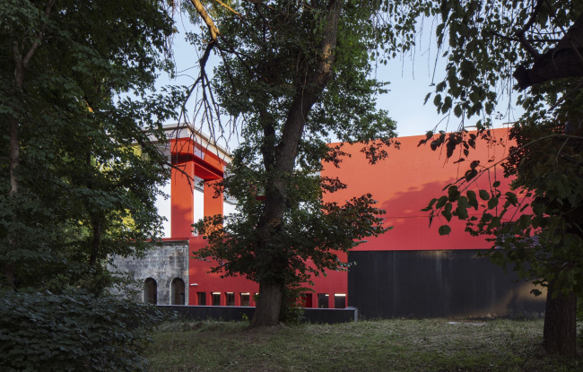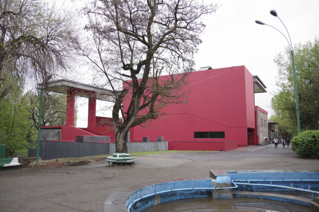 Проект реконструкции реализован в пределах существующего контура здания. Все исторические несущие и наружные стены сохранены. Фасады оставлены в неизменном виде, лишь отреставрированы по первоначальным технологиям специально приглашенными итальянскими специалистами. Эти фасады образуют некую базу из вертикальных поверхностей, поддерживающую автономно развивающуюся новую динамичную композицию. Минималистские объемы и плоскости новой композиции, отчасти напоминающие работы Луиса Баррагана, объединены единым красным цветом, что создает визуальную целостность композиции и смягчает контрасты форм. Колорит в качестве объединяющего фактора коснулся также и интерьеров. Эта яркая слитность подчеркивается четкой границей между новым и старым, что акцентирует нетронутость наследия и самодостаточность нового. Важным жестом стало и сохранение советской металлической вывески клуба, которая теперь помещена в вестибюле центра.