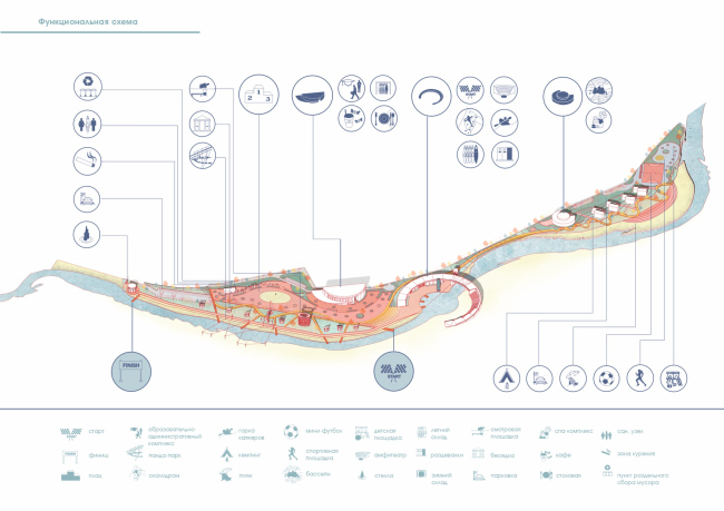 Одним из очевидных плюсов концепции является ее универсальность и гибкость. Лаконичные формы павильонов и легкие, доступные материалы позволяют приспособить их практически под любые условия. Набор функций тоже можно сужать или расширять в зависимости от интересов потенциальных инвесторов и потребностей города. К скалодрому и панда-парку можно, например, добавить, рампы для катания на скейтах, роликовых коньках и велосипедах BMX, поле для минифутбола, SPA-зоны или любые другие объекты. Более того, по расчетам архитекторов для реализации идеи не потребуется большой бюджет. Собственно, самыми затратными станут мост через реку, для которого необходимы прочные, выдерживающие течение и возможный весенний разлив, бетонные конструкции, и бассейн с его сложными инженерными системами. В результате проект вполне может стать типовым, способствуя развитию и популяризации перспективного вида спорта в России и значительно повышая качество городской среды.