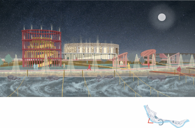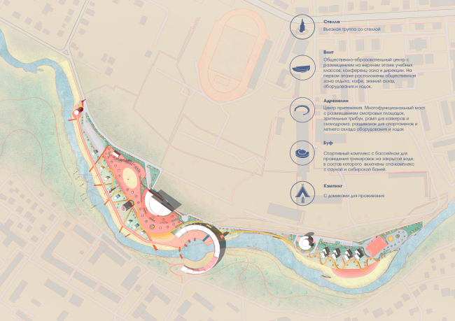 Данные принципы легко перенести и на градостроительное проектирование. ESG – своего рода манифест взаимосвязи и триединства факторов, формирующих комплексный подход к развитию определенной местности или района. Расположение букв в аббревиатуре также неслучайно. На первом месте стоит качество окружающей среды, которое при должном внимании к социальному аспекту (жители города) и грамотном управлении (муниципальные органы), позволяет правильно, ответственно и эффективно эксплуатировать территории. Центром нового спортпарка должен стать подковообразный мост, огибающий искусственно созданную в одном из изгибов русла заводь. Он связывает два берега и создает зону взаимодействия между разрозненными фрагментами городской ткани. Павильон одновременно выполняет роль стартовой рампы для каякеров и трибун, с которых очень удобно наблюдать за соревнованиями. Снаружи к мосту примыкает скалодром, а внутри разместятся раздевалки и место для хранения инвентаря. Выше по течению расположится небольшой бассейн для тренировок в зимний период, а за ним возможно организовать скромный кемпинг для участников соревнований и гостей школы. В непосредственной близости от моста, тоже в центре участка, будет построен образовательный центр с кафе, учебными аудиториями, конференц-залом и офисом администрации.