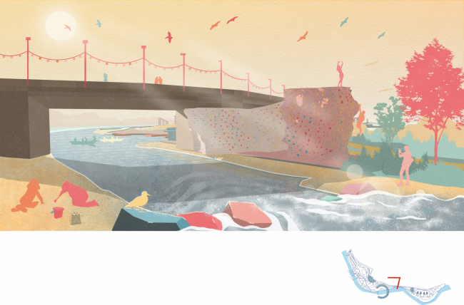 Связывает все объекты ландшафт с деревянными дорожками и смотровыми павильонами вдоль набережной. Для фрагментов мощения будут использованы красивые камни прямо из реки, что-то вроде эффектной, очень крупной гальки. Часть противоположного берега также планируется обустроить и протянуть к ней прямо через реку несколько трасс панда-парка. Запланированы и оборудованные пляжные зоны, детские площадки.