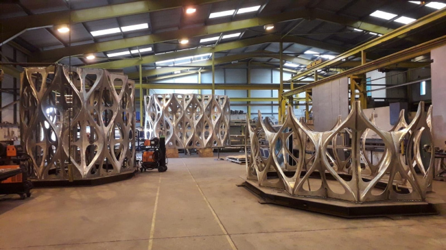 Башню изготовили в мастерской в виде восьми барабанов – с помощью лазерной резки и сварки стали, – а потом по два доставляли на место и ночью монтировали, никак не нарушая жизнь города. Крепления барабанов между собой сделаны максимально простыми, чтобы этот монтаж прошел как можно быстрее.