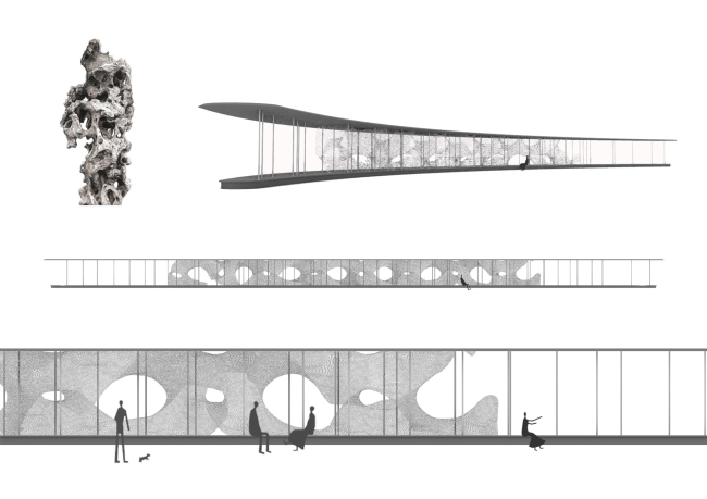 Сверху творение китайско-австралийских архитекторов напоминает ленту или рябь на поверхности воды, хотя авторы предпочитают именовать его «гибридной системой» – из-за насыщенной функциональной программы, сближающей дорожное сооружение с мини-парком или другим рекреационным объектом.