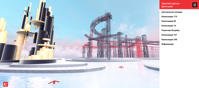 Выставка дает возможность посетителям сайта приблизиться к архитектурным объектам с рисунков Якова Чернихова, рассмотреть их более детально. Все локации виртуального пространства представляют собой объемные композиции. Здесь представлены архитектурные фантазии под номерами 173, 16, 89, 161, 179, а также «Памятник Колумбу».