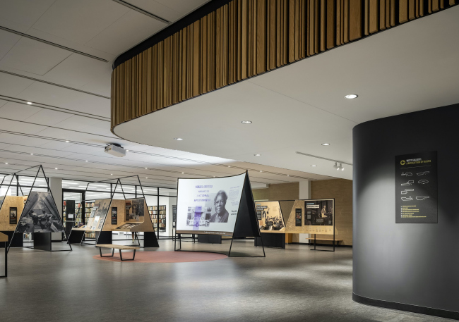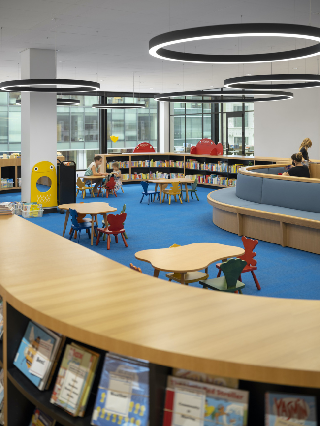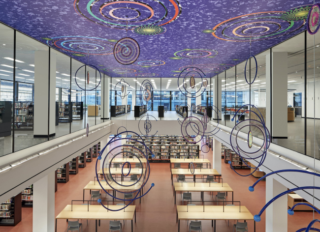 Разворот в сторону читателей и жителей города чувствуется уже у главного входа. В вестибюле архитекторы оформили фреску 1986 года, посвященную жизни Мартина Лютера Кинга, создав комфортное общественное пространство с деревянной отделкой и ступенями-скамейками. Чуть дальше расположена еще один новый мурал и, отделенное от лобби прозрачным стеклом, кафе, которое затем открывается и в городское пространство. За вертикальную коммуникацию отвечают две эффектные лестницы, пронизывающие все этажи и освещенные при помощи фонарей в перекрытиях. Они получили фирменные для нидерландского бюро динамичные органические формы и отделку из дерева. В подземном уровне, куда посетители раньше не имели доступ, устроили помещения для творчества, различных занятий и мастер-классов. Они делятся на «тихую» и «громкую» лаборатории. На втором этаже расположено пространство для детей, разбитое на три возрастных зоны. На третьем находится большой читальный зал, который теперь стал двусветным. Четвертый этаж и новый объем на крыше заняты комфортной аудиторией, вмещающей 291 человека. Она также отделана деревом.