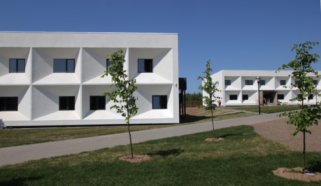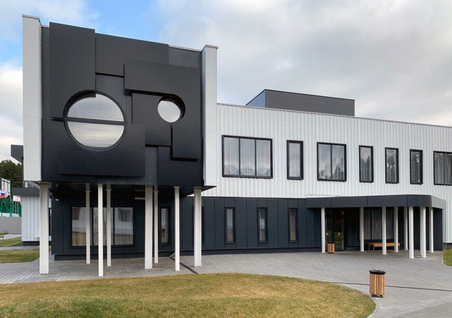 Поставленную задачу архитекторы описывают так: «нужно [было] столовку из металлокаркаса и сэндвич панели, бюджет очень небольшой». Нам, к сожалению, не удалось оценить постройку воочию, но на фотографиях она выглядит вовсе не бюджетно и напоминает о Доме пионеров на Ленинских горах. Что логично: пионерская столовая и есть. Но выглядит она внушительно, особенно – монументальный металлический коллаж на группе тонких ножек над входом, совершенно космический, как будто из «Отроков во вселенной». Да и «каннелюры» металлической поверхности фасадов добавляют и ритма, и лоска, организуя форму.