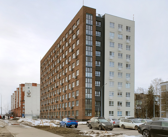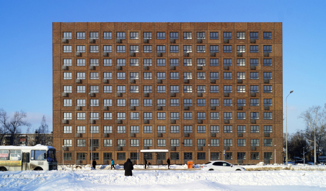 Глазу москвича этот дом, увы, сразу и неминуемо напомнит сами знаете что: распространенную стилистику строительства относительно бюджетного жилья одной известной компании. Но он не совсем таков, а может быть, даже и совсем не таков. Дом представляет собой сумму откликов на несколько обстоятельств. Одно из них – пограничное положение в дальнем районе на окраине города; другое – бюджетность строительства; третье – близкое соседство пятиэтажного микрорайона; и, наконец, четвертое – популярность терракотовой фактуры темного кирпича, способная в наше время придать лоск и аккуратность самому недорогому дому. Примерно на грани всех этих сюжетов дом и балансирует.