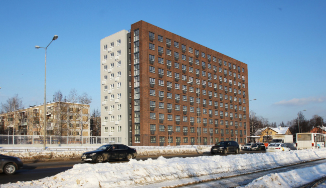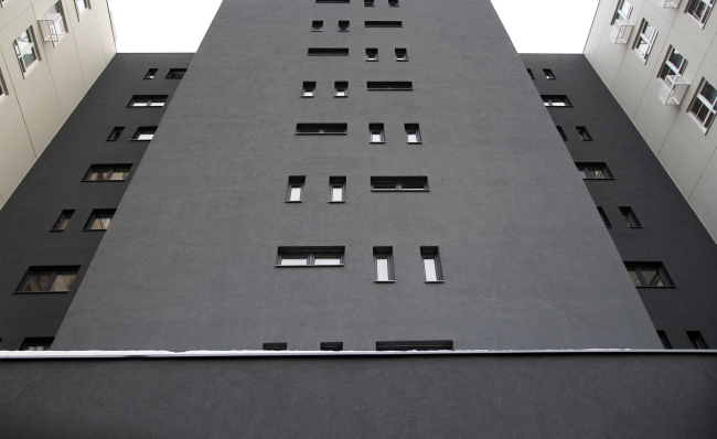 «Китайская стена» объема, обращенного к улице, честно не скрывая экономности, работает на компактность формы и, может быть, даже на благородную простоту. Кажется, что дом, чутко реагируя на нюансы окружения со стороны двора, с проспектом обращается намеренно сурово – то ли формирует фасад крупного масштаба, напоминающий пост-сталинское строительство, когда от излишеств уже отказались, но от кирпичных проспектов никуда не ушли. То ли отгораживается от рыхлой панорамы на противоположной стороне, поскольку она вот такая: