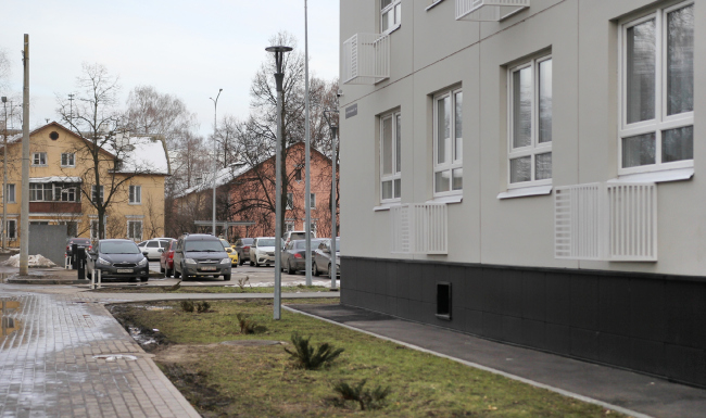 Но самое интересное впечатление производит сопоставление дома с соседями, в данном случае, с востока: в целом Автозаводский район чередует разновременные кварталы второй половины XX века, но именно тут приютился район конца 1940-х, двухэтажные домики с фронтонами «бюргерского» типа; при взгляде на такие принято вспоминать пленных немцев, хотя далеко не всегда их участие подтверждается. Это удивительное и обаятельное соседство; надо сказать, что новый дом с ним каким-то образом справляется. Возможно, из-за простоты формы.