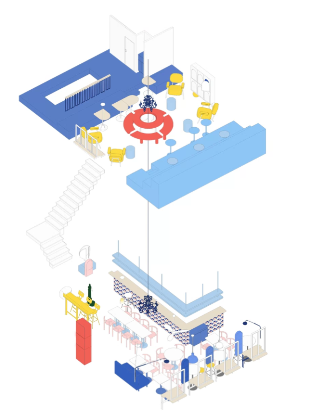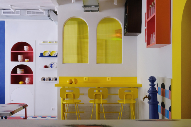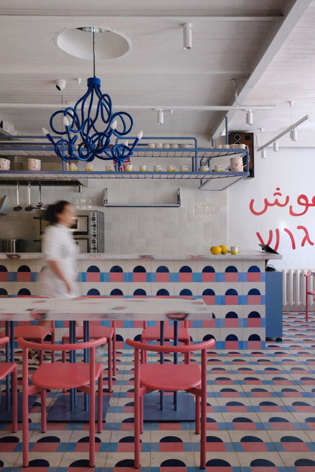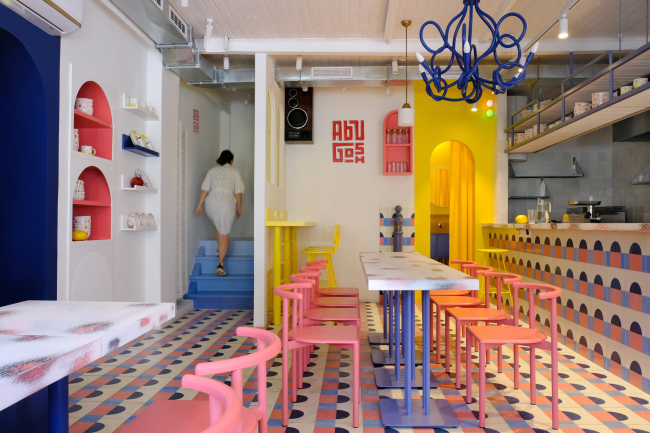 Принт плитки разработала португальский дизайнер Элиса Пассино. В нем совмещены главные цвета кафе – голубой, розовый и синий, а также форма арок, которая повторяется в интерьере. Рядом со входом располагаются полки и ниши для продажи керамической посуды.