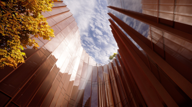 В качестве основного материала выбран бетон сдержанного красного тона, который не будет контрастировать с окружающими кирпичными корпусами. От солнца окна защитит металлическая сетка.
