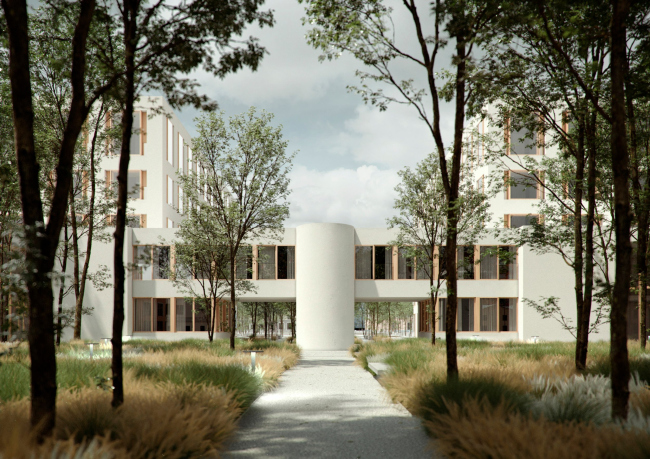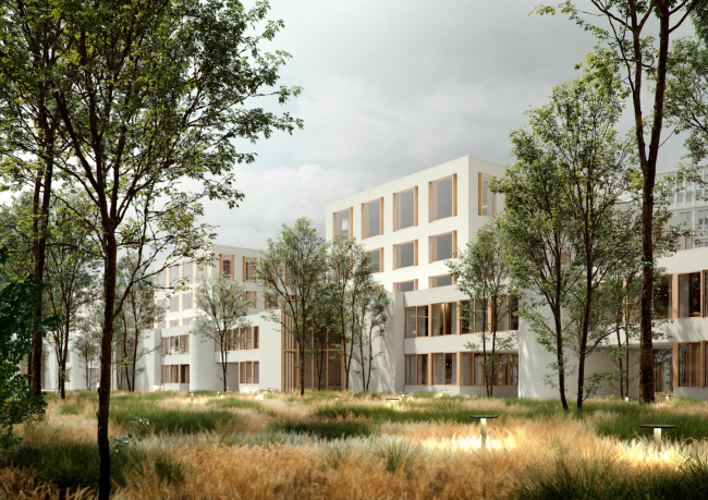Прямоугольные пятна бывших выставочных павильонов займут жилые дома, уже не двух-, а пятиэтажные. Их объемы вдохновлены, по словам авторов, примерами конструктивистов: со светлыми штукатурными фасадами и крупными окнами, в том числе угловыми, с рамками и вставками из светлого дерева.