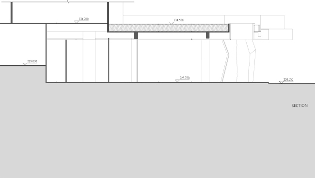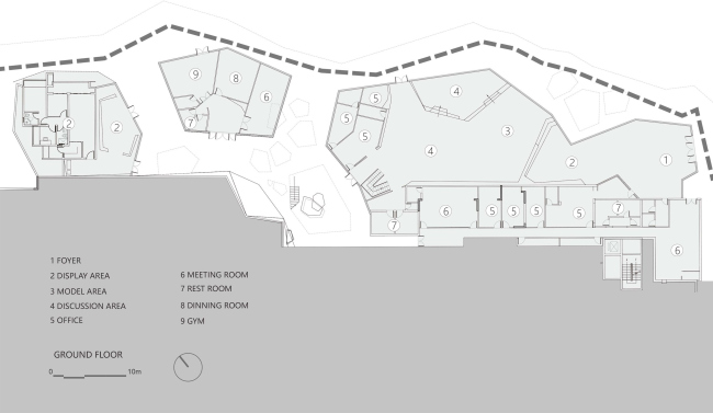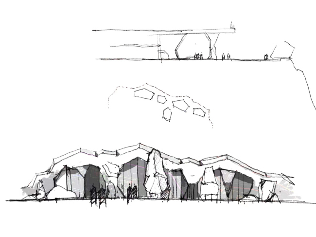 Вдоль самой кромки утеса протянулся бассейн. Из зоны отдыха или с других нижних точек поверхность искусственного водоема сливается с поверхностью реки, создавая иллюзию единения. За бассейном, практически в основании здания, находятся несколько отдельных стеклянных павильонов, каждый из которых имеет собственную, довольно сложную геометрическую форму и жесткую, ломанную линию самого остекления. Они накрыты озелененной кровлей на массивных каменных пилонах, неровный край которой также поддерживает угловатый, резкий ритм. В результате внутри, между функциональными зонами, образуются затененные общественные пространства, напоминающие систему пещер. Естественный свет попадает внутрь в основном через специально прорезанные в кровле фонари, которые опять же получили неправильную, угловатую форму.