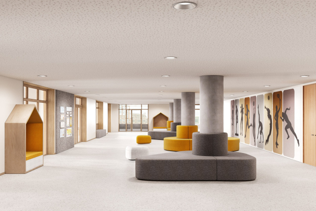 Интерьер рассчитан на разнообразие сценариев и впечатлений – так, в центральном атриуме планируется горка, по которой дети смогут спуститься, вместо лестницы, со второго этажа на первый – как на детской площадке, получив настоящий fun, что позволит быстрее «подружиться» со зданием.