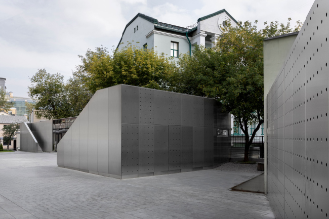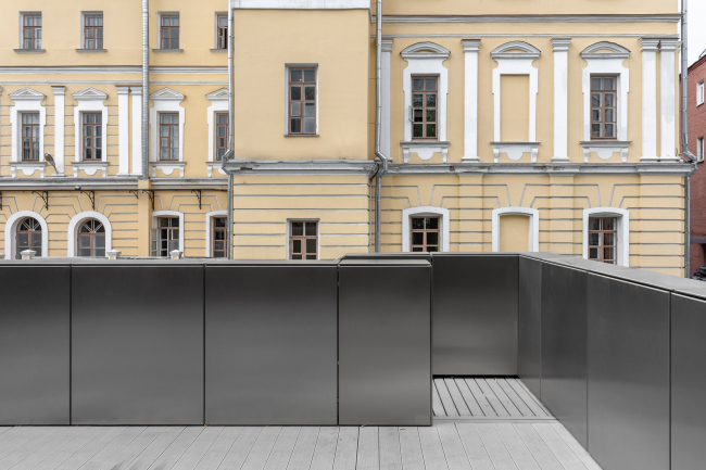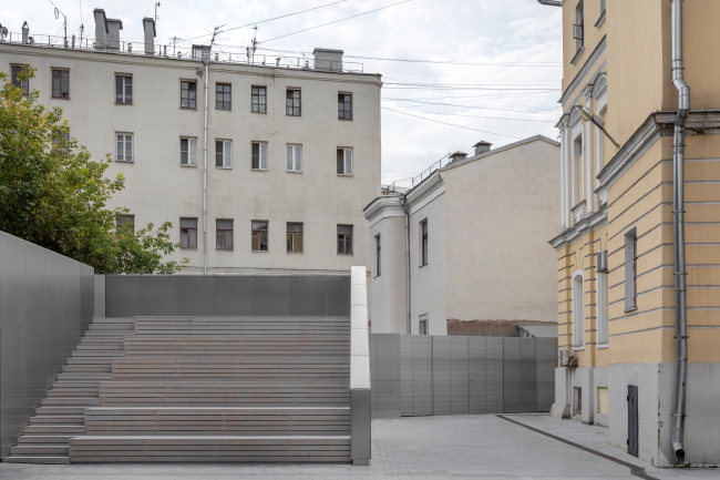 Благоустройство по-театральному: во дворе главного корпуса ГИТИСа появился амфитеатр, танцевальный зал, а также помещение для хранения и экспонирования реквизита, созданного студентами.