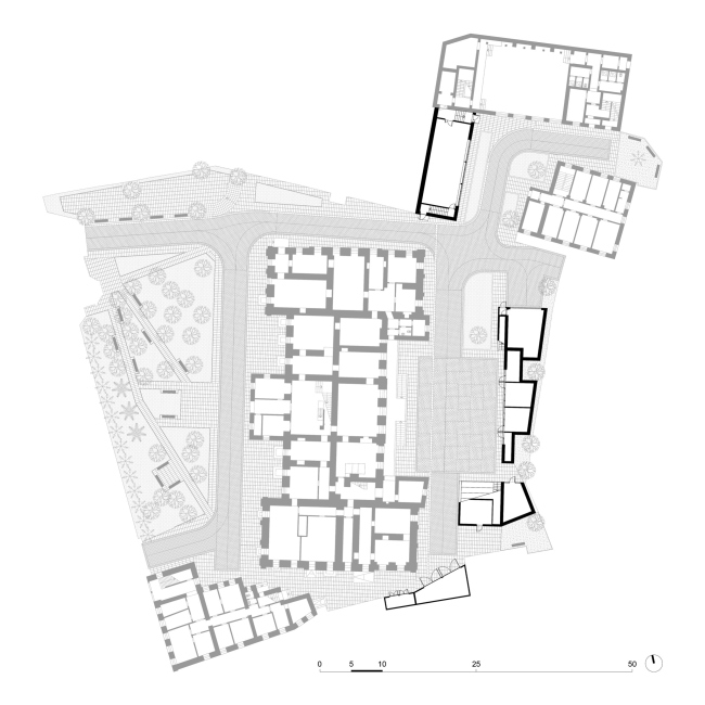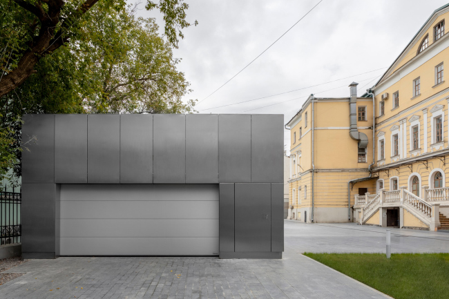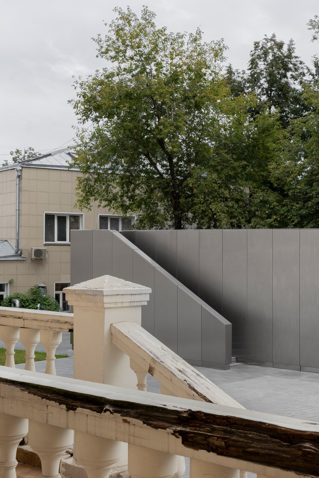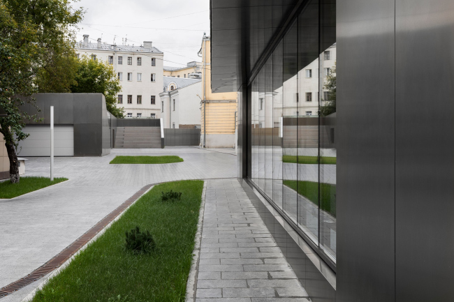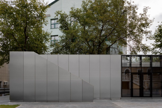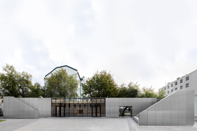 Новые объекты двора из нержавеющей стали и стекла – подчеркнуто современные. Единство с главным корпусом института, XVIII века, достигается за счет организации пространственного порядка и отражающих поверхностей.