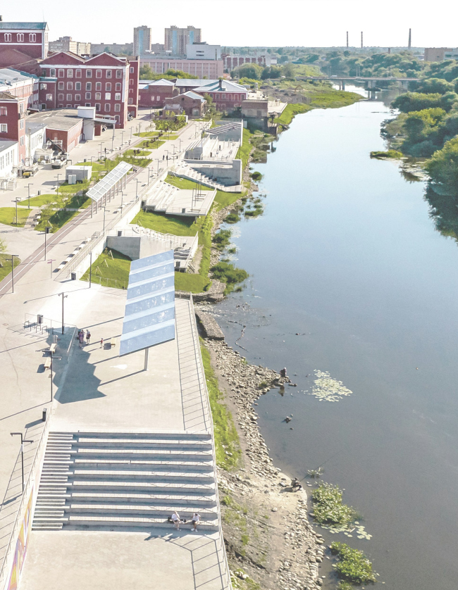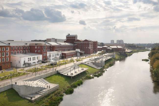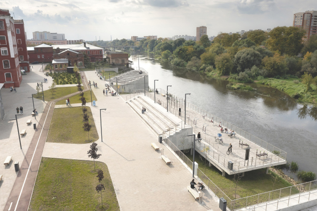 Заброшенная ранее набережная, прилегающая к фабрике, открылась городу и стала местом проведения уличных гуляний, городских мероприятий. Пирсы-площадки позволили наполнить набережную событиями: музыканты получили сцену для репетиций и уличных концертов, любители спорта – тренажеры у кромки реки, малый бизнес – место для проведения мастер-классов. Пирсы представляют собой амфитеатры различных конфигураций и располагаются на склоне, открывая живописные ракурсы на реку.