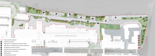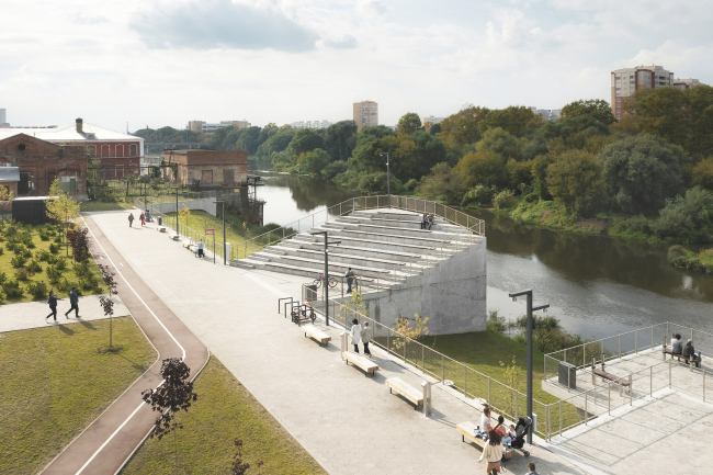Описание предоставлено архитекторами Набережная в Орехово-Зуево тянется вдоль бывшей Никольской мануфактуры Саввы Морозова, где бурно развивалась текстильная промышленность и социальная инфраструктура для рабочих. Жизнь фабрике давала Клязьма: доставка сырья, выработка энергии, техническое использование воды обеспечивались за счет заднего двора с воротами, обращенными к реке. Сохранившиеся части железобетонных пирсов для разгрузки барж стали прообразами будущих площадей, расположенных на уступах берега.