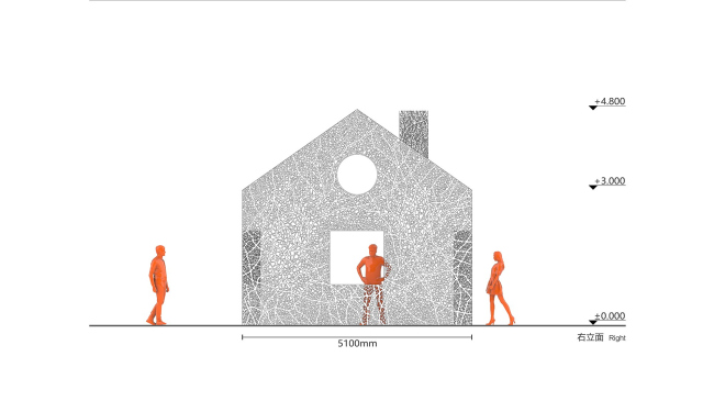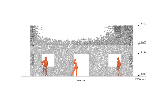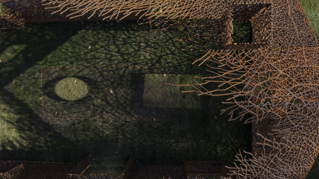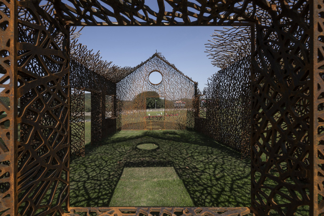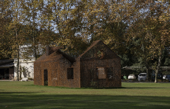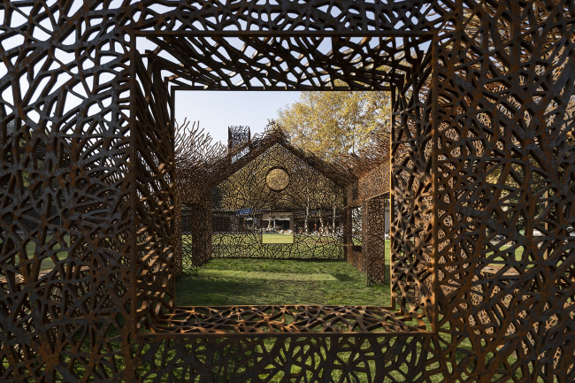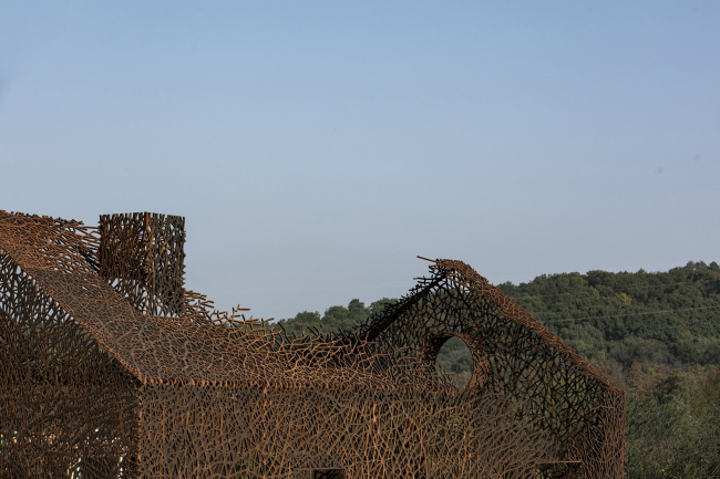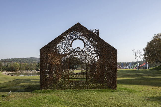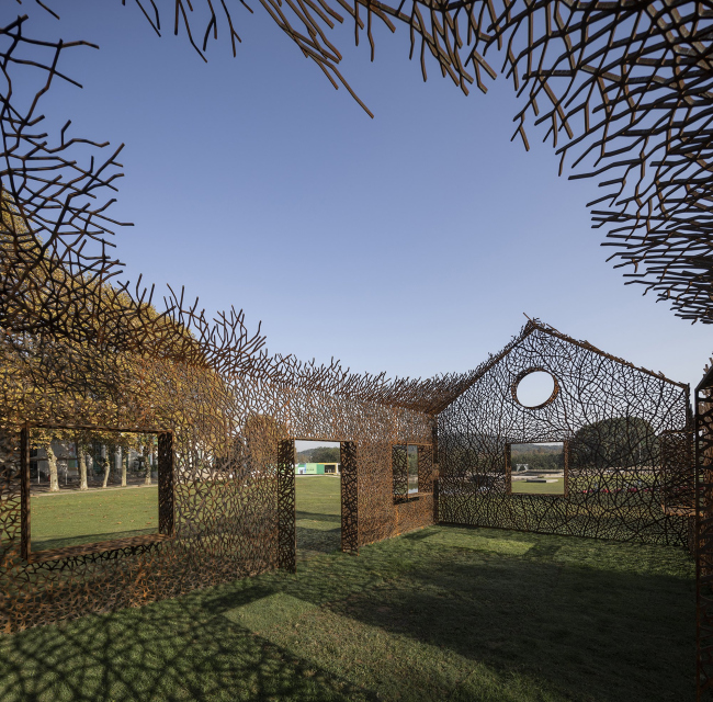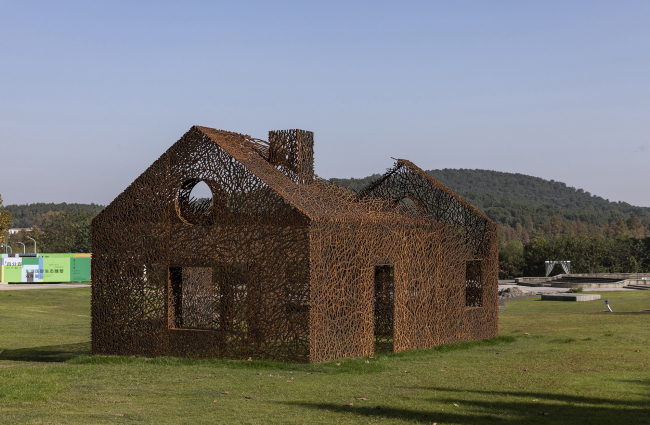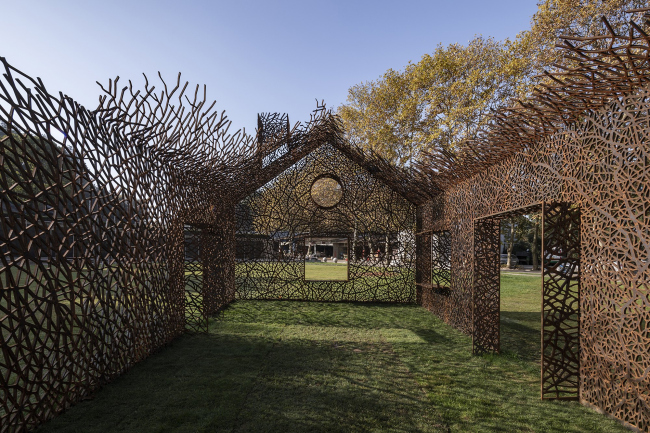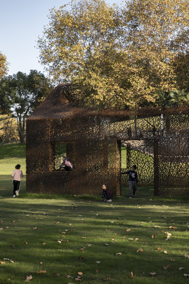 Инсталляция выполнена из стали кортен методом лазерной резки. Кортен выбран как материал благодаря своему насыщенному цвету, со временем темнеющему – он напоминает о винно-красных осенних листьях плюща. Еще одним соображением стала его прочность: при использовании листов толщиной 2 см ажурные стены являются самонесущими, не требуя никаких дополнительных опор.«Исчезнувший дом»Фото © Jin Weiqi