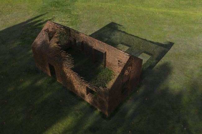 Инсталляция «Исчезнувший дом» представляет собой трехмерный абрис архетипического жилища с двускатной крышей, окнами и дверью. Эта ажурная оболочка имитирует плющ, символ уютного, обжитого дома – но он уже исчез, и лишь растение напоминает о доме и его обитателях.