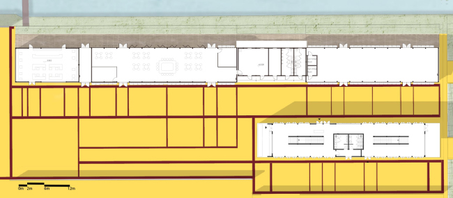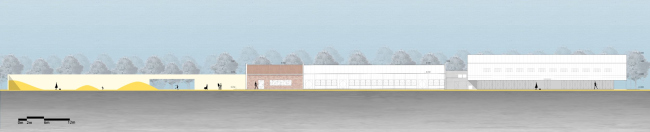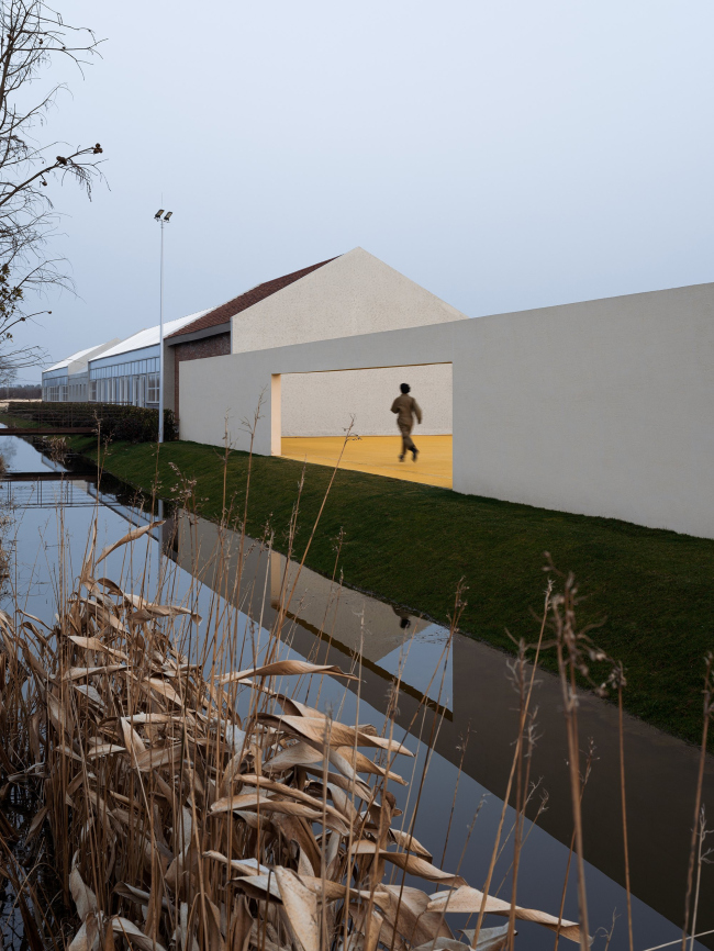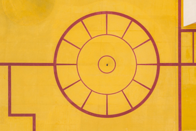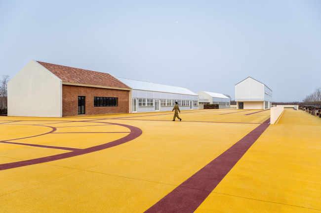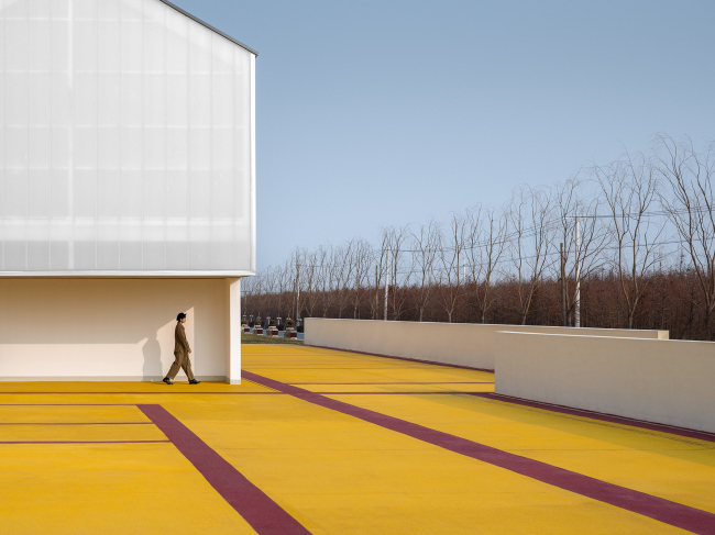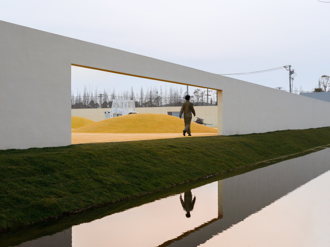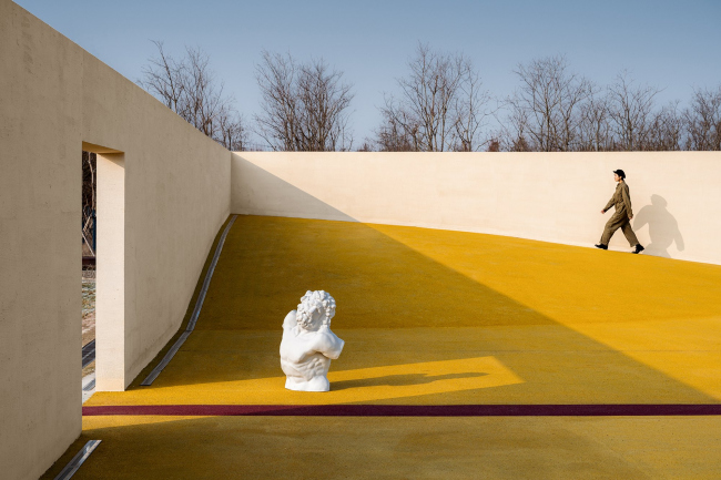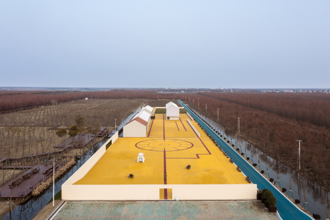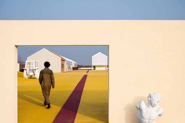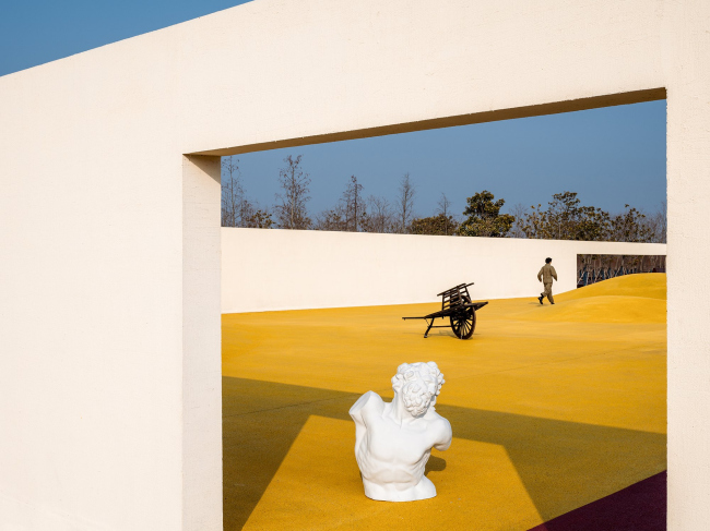 Так гумно на острове Чунминдао стало золтисто-желтым абстрактным пространством, где царит вечный праздник урожая, можно бесконечно отдыхать, есть и пить. Здесь есть холмики – как будто горы риса, предусмотрено место для костра, а старый трактор стал подобием античного слепка. С окружающими полями эту волшебную страну связывают проемы в белых стенах ограды. Напольное покрытие выполнено из пористого, водопроницаемого бетона.