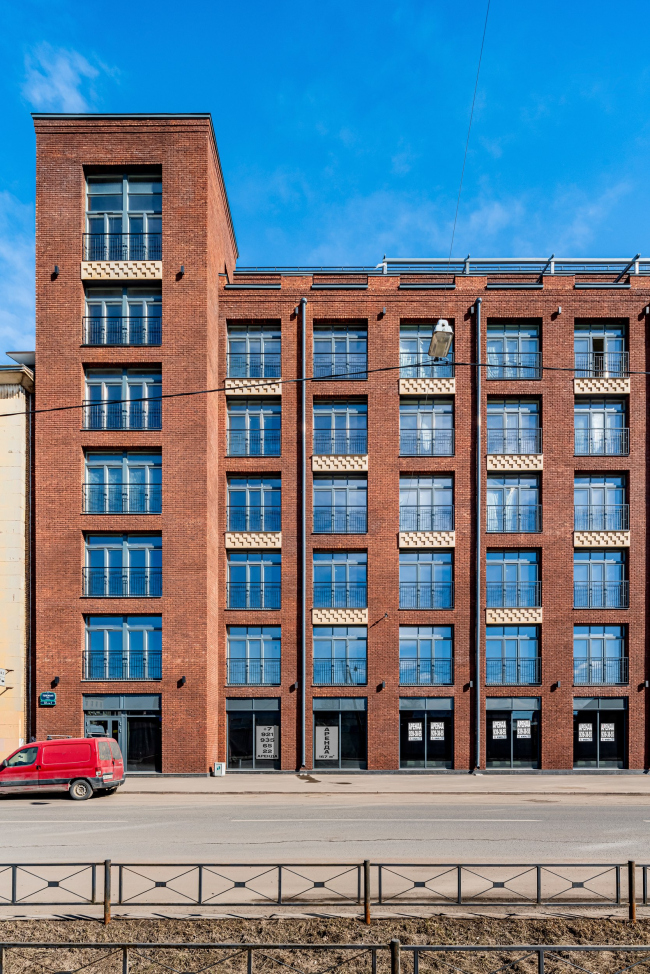 Третий «дом» – единственный без оси симметрии и самый лофтовый благодаря крупной сетке окон и кирпичу винного «фабричного» оттенка, глубину которого подчеркивает молочный орнамент в «шашечку». На стыке с соседним пятиэтажным домом 1961 года подстройки красная линия улицы меняется, что позволило добавить довольно массивную и чуть выступающую акцентную башню. По словам архитекторов, этот фасад стилистически связан со строгой функционалистской архитектурой Европы начала XX века.
