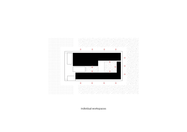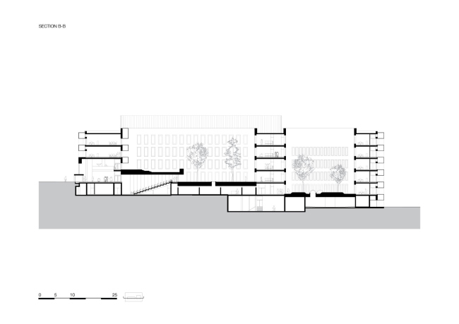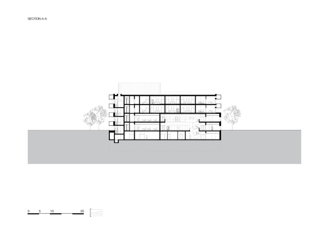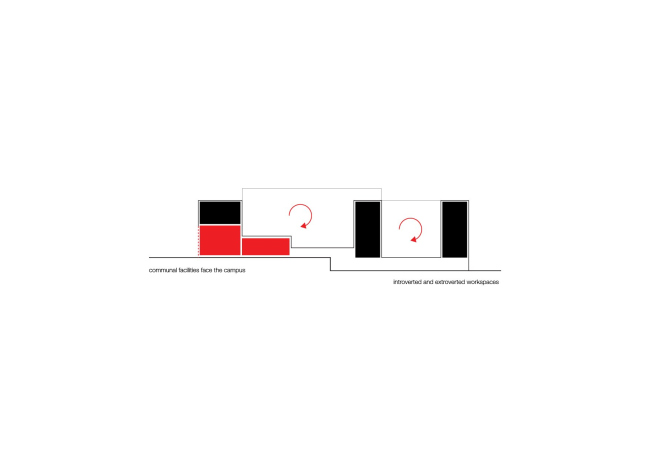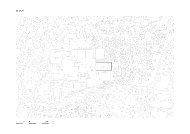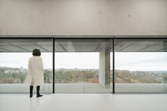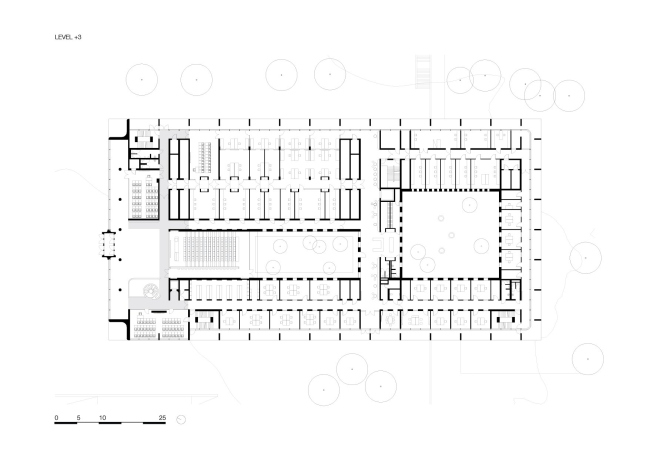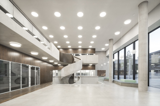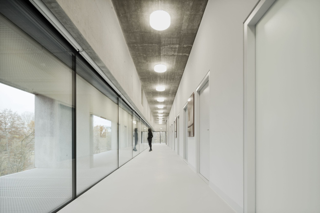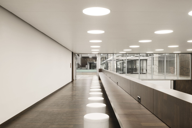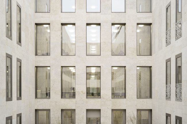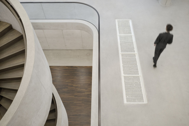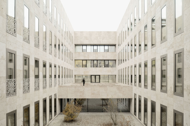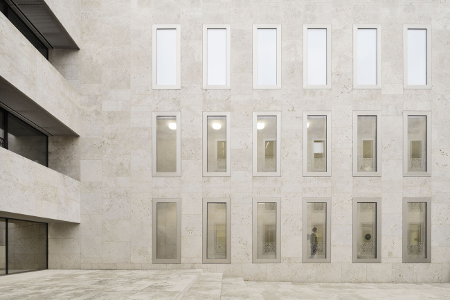 В здании два внутренних двора – более публичный северный, ближе к главному входу, и обращенный к зеленым склонам южный. Они облицованы камнем, любимым материалом KAAN Architecten, и демонстрируют аккуратную сетку окон. Это напоминание об историческом центре Тюбингена, где еще недавно располагались кабинеты исследователей и преподавателей, теперь выходящие в эти дворы. Северный расположен чуть выше южного, отвечая перепаду высот на участке.