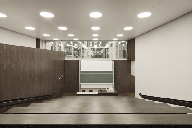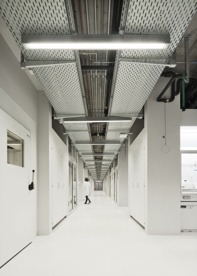 Также в здании есть поточная и семинарские аудитории, а еще – сгруппированные в два блока лаборатории, охватывающие с восточной стороны все шесть этажей. Снизу вверх темы исследований меняются от грубых к тонким материям, от помещений для изучения минералов до «чистых комнат».