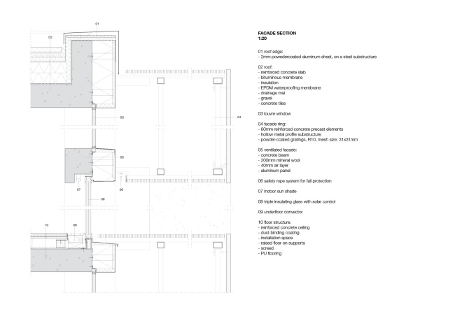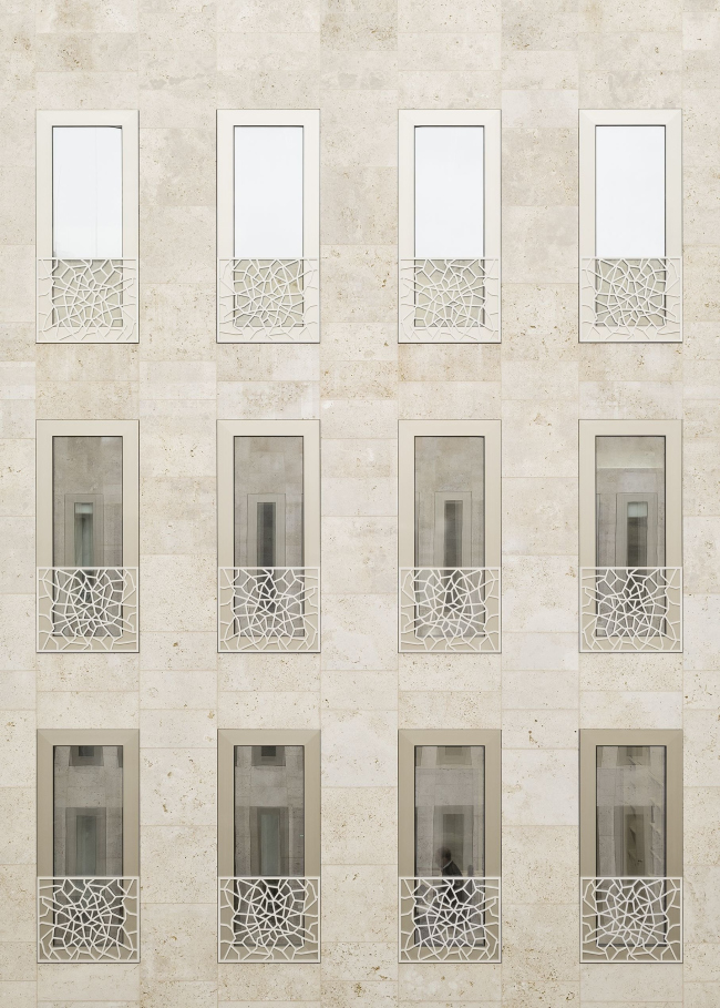 Здание хорошо просматривается снаружи – особенно в сумерках, когда внутри горит свет. Этот эффект подчеркнут непрерывными лентами стекла, так как «каменные» выступы поддерживают стены жесткости, поставленные снаружи и потому не нарушающие поверхность остекления.
