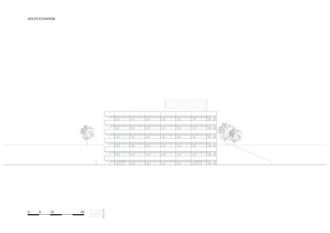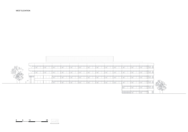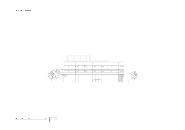 С севера расположен главный вход с прозрачным вестибюлем, где 7,5-метровые опоры разделены надвое по вертикали: это произведение искусства kunst am bau тюбингенского художника Мартина Бруно Шмида, который приглашает подумать над темой конструкции, несущей большую нагрузку. Здесь же помещена бетонная лестница скульптурных форм и места для занятий студентов.