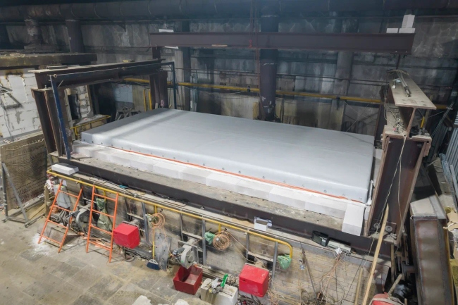 Испытания системы проводились на специальной установке – печи, позволяющей имитировать пожар внутри объекта и оценить его влияние на достижение предельных состояний конструкции с предельно возможным для стандартных испытаний пролетом – 6 метров (Рис.1). В ходе испытаний система ЭКСТРА подтвердила предел огнестойкости REI 90 (не менее 1,5 часов интенсивного огневого воздействия – пожара), что позволит применять ее на объектах с повышенными пожарно-техническими требованиями, включая здания 1-й степени огнестойкости, например, жилые дома, больницы и другие социальные объекты. Система соответствует требованиям профильных нормативов по пожарной опасности и требованиям Федерального Закона №123 «Технический регламент о требованиях пожарной безопасности».