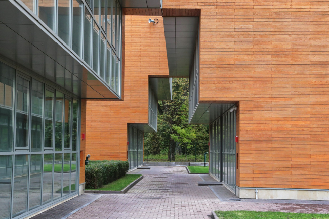 По периметру институт отделан деревянными ламелями, которые визуально объединяют корпуса и дворы студенческих кварталов. Ребристую структуру на внешнем контуре здания удачно подчеркивает стекло Guardian SunGuard HP Neutral 60/40 умеренной зеркальности.Помимо эстетических функций, магнетронное напыление, нанесенное на стекло, создает эффект солнцезащиты и теплосбережения.