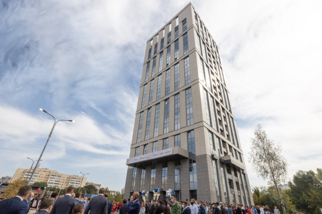 Фасад здания отделан светлой керамической плиткой и витражами. В самом высоком учебном корпусе университета 100 современных аудиторий и более 60 компьютерных классов.