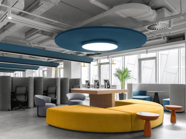 Архитекторы запланировали большое количество зон, подходящих под разные рабочие задачи и настроение сотрудников – переговорные комнаты, Skype-комнаты, коворкинги и обособленные места – работать можно из любой удобной точки. Благодаря своей гибкости офис подстраивается под конкретные задачи проектных команд и позволяет сотрудникам самим выбирать комфортное место для работы. Центральная зона пространства имеет сложную форму, которая с каждого угла раскрывается по-разному, что существенно улучшает видовые характеристики пространства.