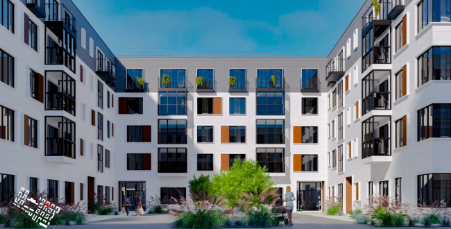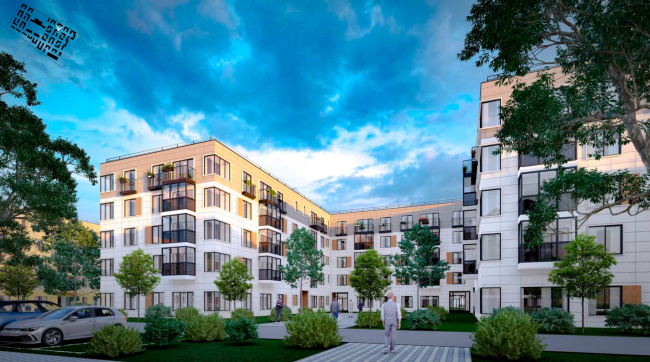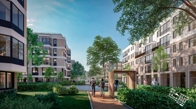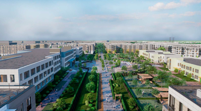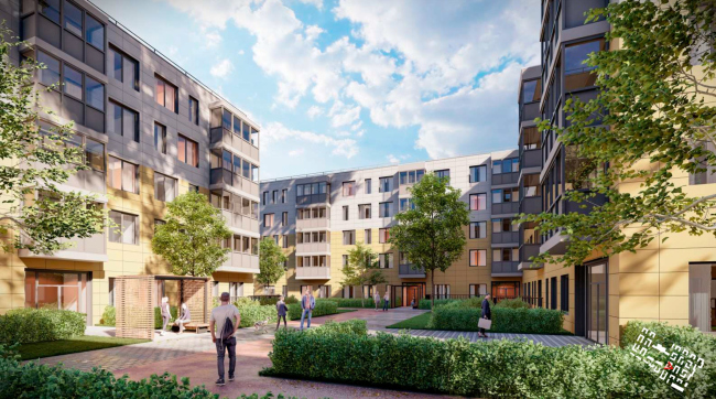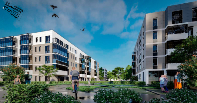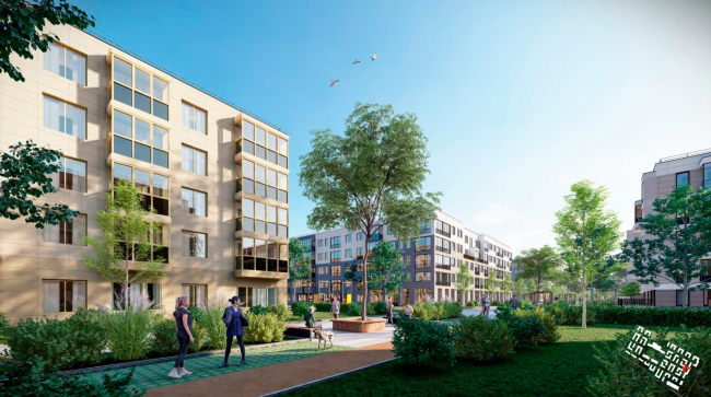 Бюро «А.Лен» формирует жилой комплекс из урбан-блоков, «набранных» из девяти типов секций, которые отличаются конфигурацией, фасадами и планировками – таким образом в рамках скромного бюджета достигается разнообразие среды. Высота домов не превышает 5 этажей, а габариты урбан-блоков меньше, чем в окружающей застройке и более комфортны человеку. Через весь квартал проходит широкий бульвар с круглой площадью, расположившейся перед школой и двумя детскими садами. Бульвар не пересекают автомобильные дороги, дома «подпитываются» через дороги внешнего периметра и карманы с разворотными площадками. Ось бульвара ориентируется на арку гостиницы, выходящей на Пулковское шоссе. Со стороны магистралей располагаются наземные паркинги. Район рассчитан на 5000 жителей.