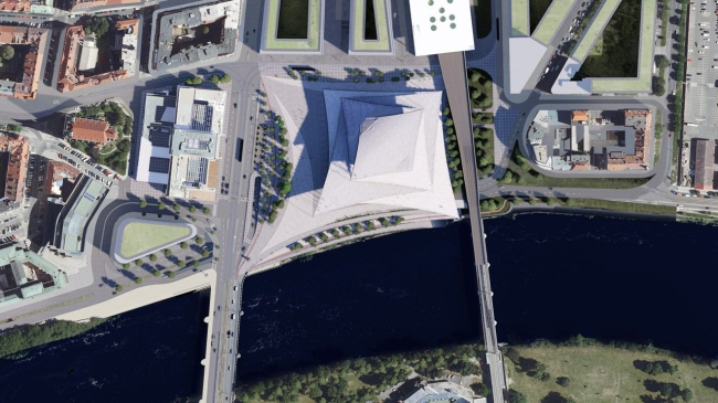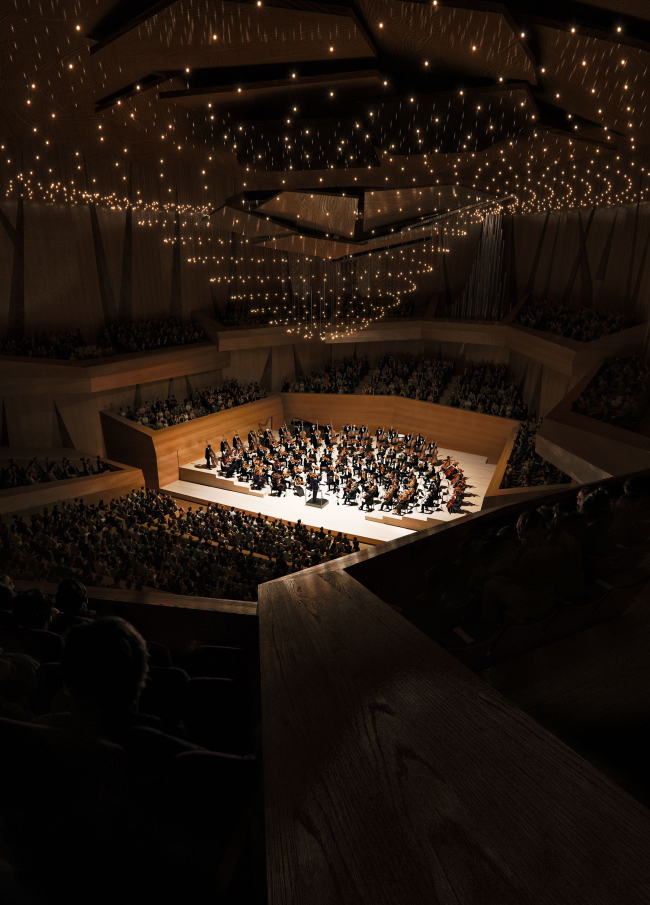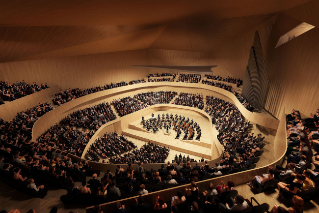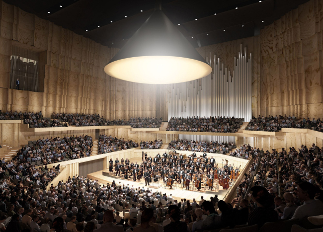Расположенное на берегу Влтавы здание по проекту BIG будет постепенно подниматься от воды к городу серией террас, которые станут продолжением площади и парка вокруг. С верхних уровней можно будет полюбоваться видами Праги. Террасы также обеспечат филармонии сразу несколько «точек входа».