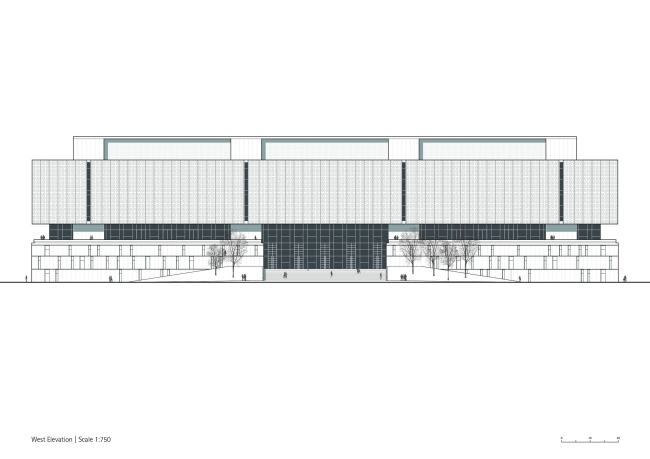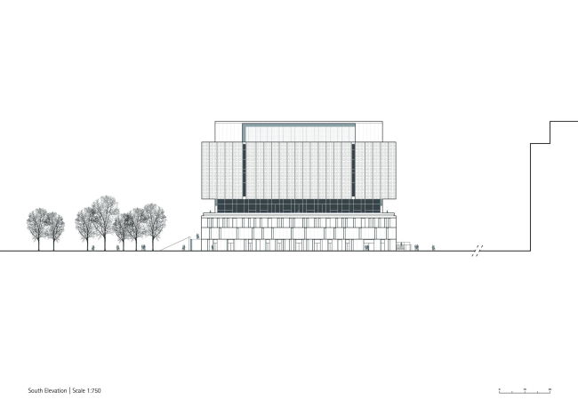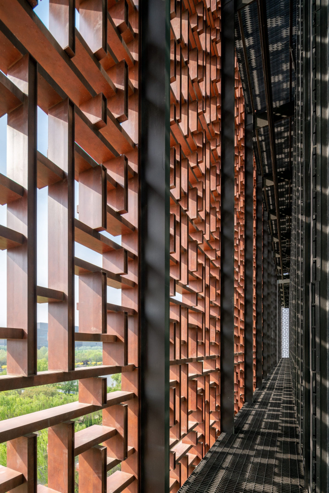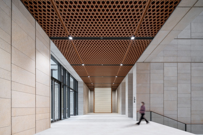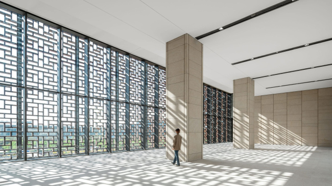 Огромное здание (200х75х50 м) обязано своими габаритами дизайн-коду для культурных учреждений по берегам реки Яншань, к которому gmp отношения не имели. Однако они постарались сделать этот масштабный объем достаточно дробным и динамичным. Облицованный гранитом подиум несет остекленную среднюю часть, а над ней начинается основной объем, забранный орнаментальным экраном. Он защищает интерьер от солнечных лучей, напоминая о традиционных узорчатых решетках, а также о предметах декоративного искусства.