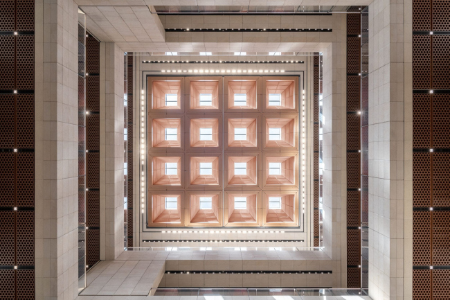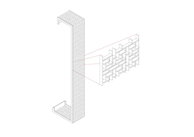 Орнаментальный экран создан из фиброармированного пластика, изготовленного методом пультрузии и окрашенного в медный цвет. Здесь применен базовый модуль в 3х2,2 м, из которого затем были составлены блоки во всю высоту (22 м): равномерное распределение узора позволило избежать разделения на главную и второстепенные части здания. Зазор между экраном и скрытым за ним остекленным фасадом составляет почти 1,5 м.