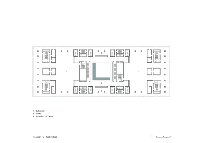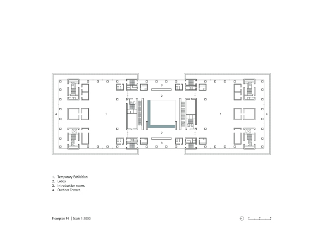 По периметру здания поверху подиума устроена терраса, которую затеняет 6-метровый вынос основной части постройки. Внутрь ведут два главных входа: там посетителей встречает вестибюль, аудитория на 400 мест и зал временных интерактивных выставок. Атриум во всю высоту музея организует выставочные пространства: туда можно попасть из огибающих его галерей.