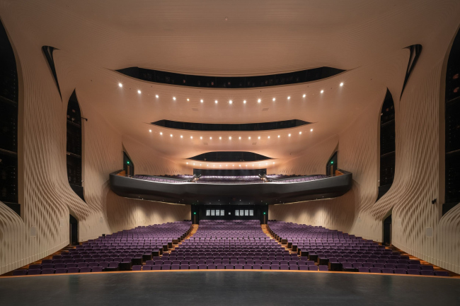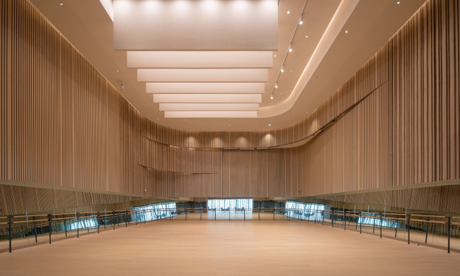 Кроме двух залов архитекторы предусмотрели различные репетиционные пространства, административную часть, ресторан, торговую зону. Как и во внешних решениях, внутри архитекторы организуют пространство при помощи сложных, прихотливо взаимодействующих друг с другом объемов и плавных линий. В оформлении как общественных зон, так и самих залов активно использованы деревянные панели, перекликающиеся с решением фасадов.Центр исполнительских искусств района Баоань© Rocco Design Architects