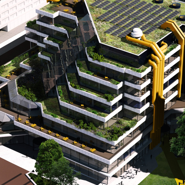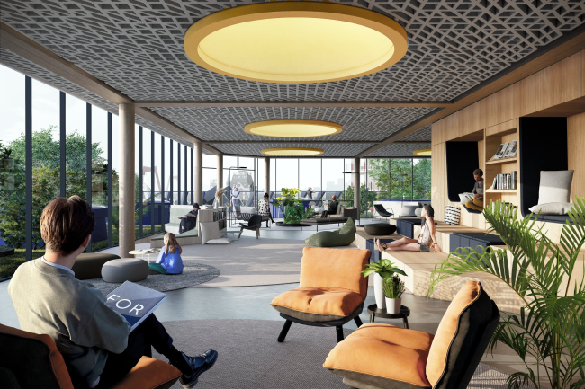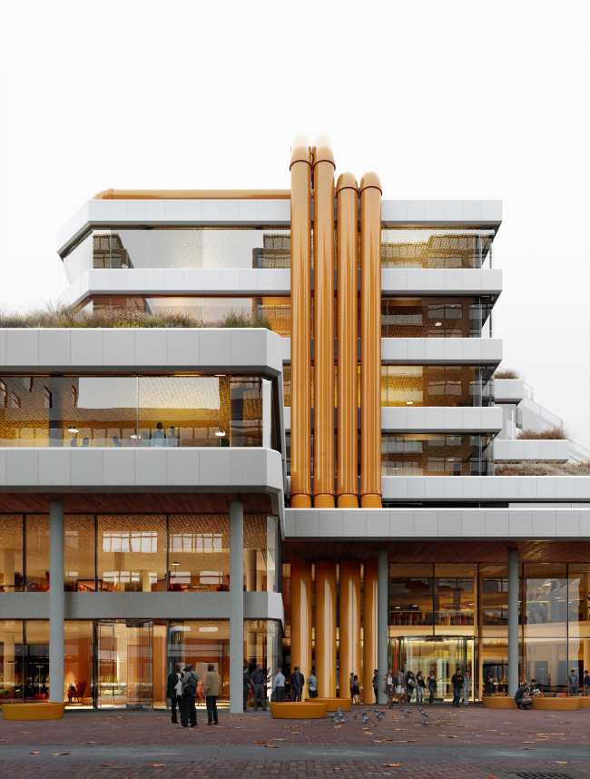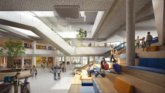 Радикально изменится интерьер: упомянутое книгохранилище и многие стеллажи заменят пространствами для индивидуальных и групповых занятий, проведения воркшопов и даже детским скалодромом. Учитывая специфику цифровой эпохи, библиотека должна привлечь горожан не только книгами, но и своей ролью пресловутой «городской гостиной» с множеством возможностей и функций. Верхний этаж займет тихий читальный зал, окруженный зелеными балконами, а также открытая терраса с видами города.Центральная библиотека Роттердама – реконструкция© ATCHAIN