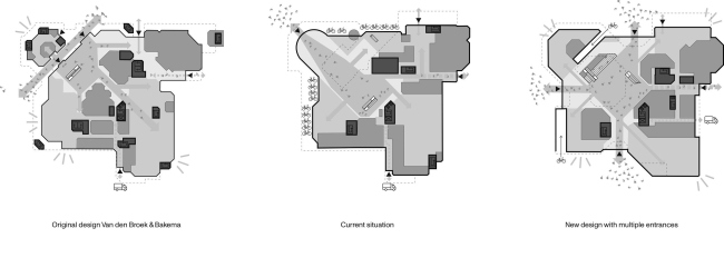 По замыслу архитекторов, снаружи появится современное остекление, а желтые трубы сохранят свою функцию, но при этом удлинятся до земли, став более заметным в городской среде знаком библиотеки. Неудачно расположенный главный вход дополнят несколько новых – по одному с каждой стороны. Книгохранилище сменит новый объем из дерева и стекла, но такого же синего цвета, чтобы сохранить первоначальный колорит. Неудачно смещенные при строительстве эскалаторы займут место, предназначенное им Яапом Бакемой.