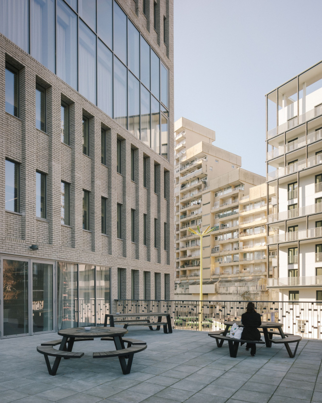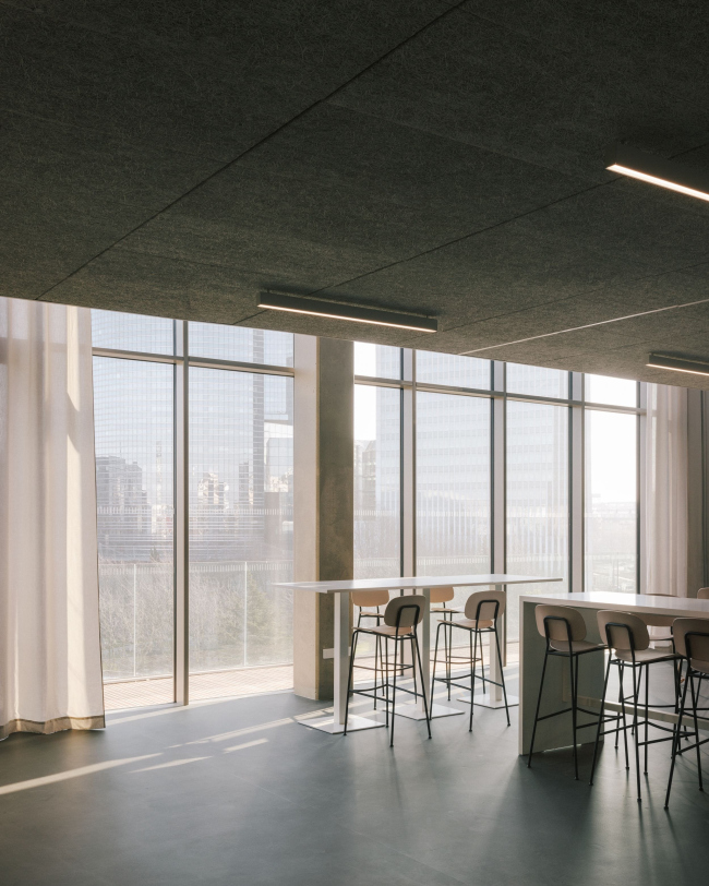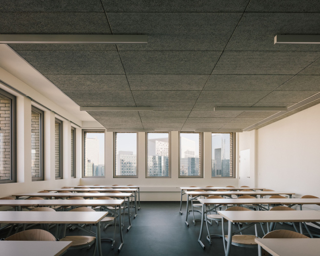 В интерьерах создан максимум возможностей для случайных встреч и неформального общения – наиболее продуктивной среды для эффективной учебы и появления новых идей. Этому служат двухсветные «агоры», отмеченные на фасадах остекленными нишами с открытыми террасами. Там студенты могут заниматься самостоятельно за компьютерами. Тщательно продуманы и остальные общественные зоны – даже коридоры и террасы.