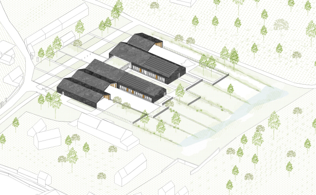 Сами пять одноэтажных вытянутых объемов разной длины расположены вдоль склона, подчиняясь естественному движению. Ему следует и дождевая вода, текущая в специальный водоем в нижней части участка. Вся эта общая ленточная планировка восходит к так называемому земледелию открытых полей, распространенному в средневековой Европе (отдаленный аналог российской чересполосицы).
