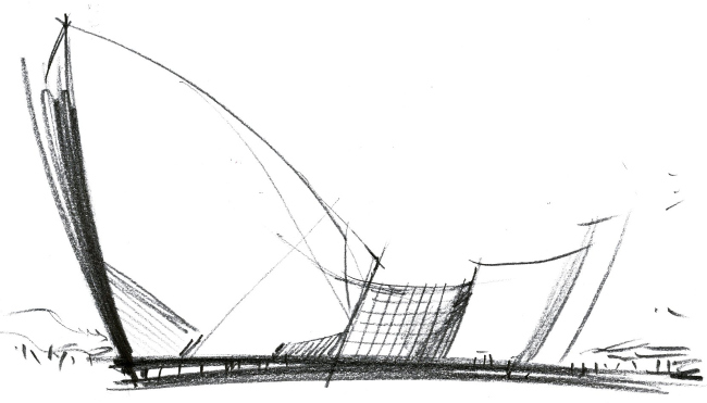 Внешние стены по сути просто огораживают пространства залов, формируя единый организм. Их поверхности, несмотря на различную кривизну, разбиты на непроницаемые стандартные модули размером 2х3 м, которые были произведены заводским методом и закреплены на стальных балочных конструкциях. Такое решение позволило существенно удешевить и ускорить строительство. Стеклянные вставки и подсвеченные щели между более крупными компонентами фасада действительно заставляют вспомнить о надутых парусах лодок. Эффект заметно усиливается в темное время суток. Сами прихотливые линии «парусов» одновременно напоминают о девяти главных изгибах русла реки Хуанхэ. Все это накрыто кровлей, в которой использованы стальная сетка, легкие композитные панели со стальными рамами и влагостойкая ТПО мембрана.