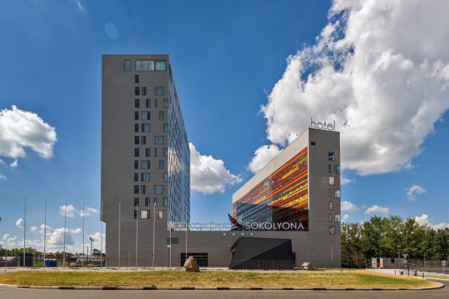Интересно же то, что столь давний проект в общем-то не очень устарел. Есть, конечно, изменения, к примеру, по настоянию заказчика фиброцементные плиты на фасадах заменили на керамогранит; окружили все железным забором; да и к названию гостиницы – "Соколёна" и ее предсказуемому логотипу в виде птички архитектор, по его словам, отношения не имеет. Но все это детали, такие замены по-прежнему сплошь и рядом случаются в Москве и Петербурге, что уж говорить о микрорайоне Нефтяник; искажения неприятные, но сравнительно не существенные. Поскольку основные темы сохранены и замысел считывается.