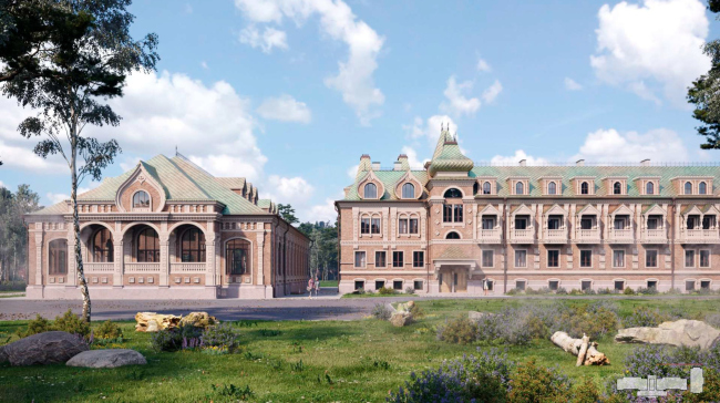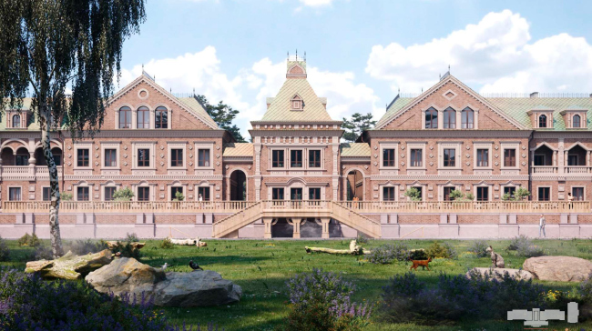 Согласуясь с общей концепцией «деревни», авторы предложили здание в русском стиле. Два симметричных гостиничных крыла соединяются через корпус выставочного зала. Бассейн располагается отдельно из-за требования КГИОП рассредоточивать здания в зоне охраняемого природного ландшафта.