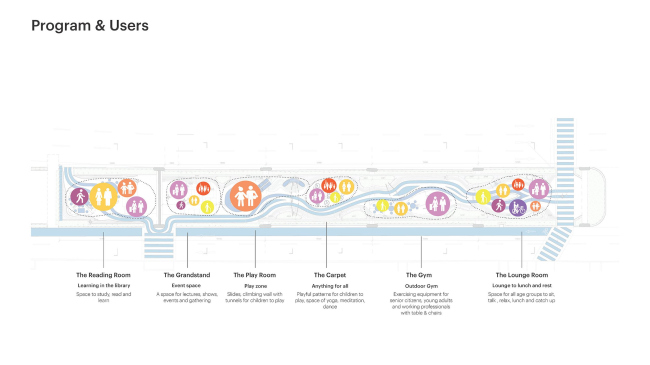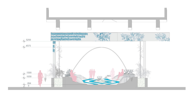Фрагмент эстакады длиной 200 м превратился усилиями архитекторов в череду уютных «комнат», защищенных от палящих лучей солнца и шума и наполненных зеленью. Последовательно друг друга сменяют: читальня, зона для различных мероприятий, детская игровая площадка, свободная зона для йоги или, например, танцев, тренажеры и отдельное пространство для отдыха или перекуса. Все они получили трехмерный «ландшафт», объединяющий все «комнаты» и добавляющий им динамики. Крупноформатная темно-синяя графика на белом бетоне отвечает за визуальную айдентику и частично распространится на другие фрагменты эстакады.