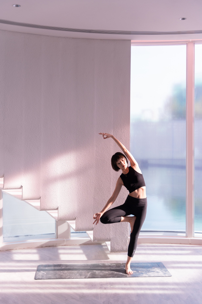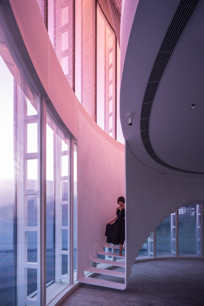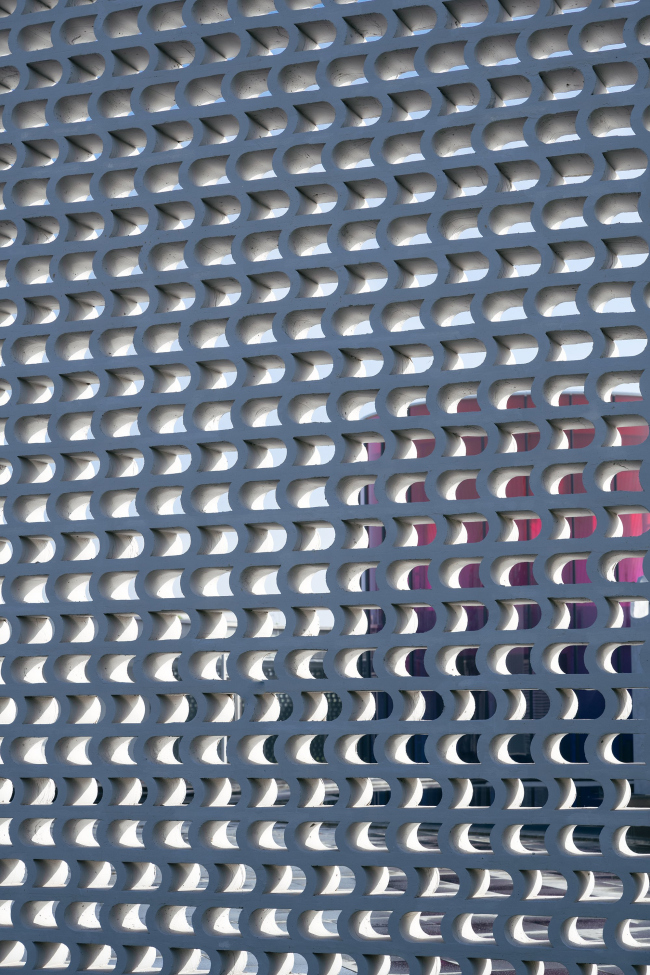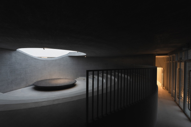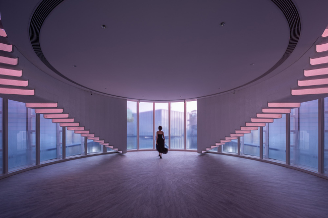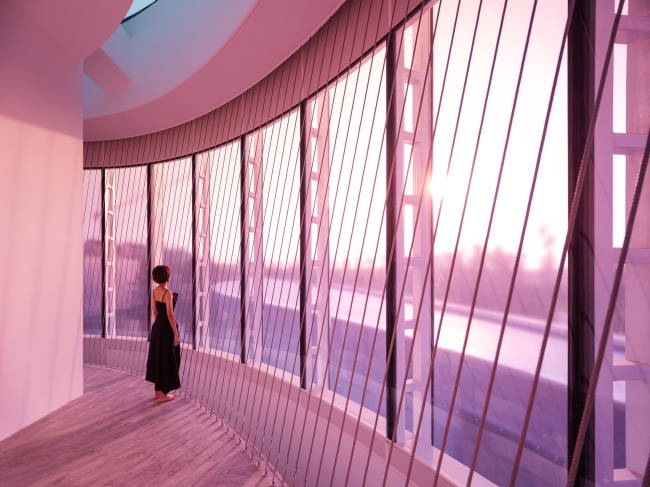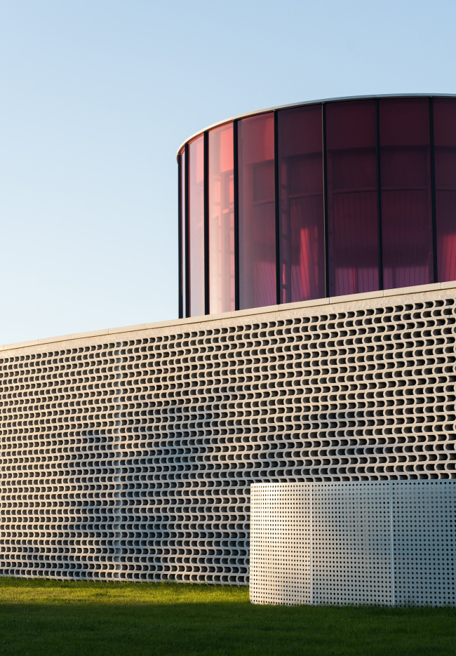 Внутрь попадают через погруженный ниже уровня земли небольшой театральный зал с проемом в кровле: акустически этот белый округлый объем изолирован от остальных частей музея. В высоком цилиндре из красного стекла на первом этаже помещена студия йоги, наверху – раздевалка. В прозрачном прямоугольном объеме находится балетная студия.