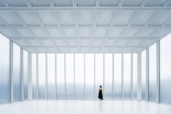 Изгибающаяся вдоль двора галерея частью вмешает наполненные светом выставочные залы, частью – изолированные от внешнего мира рисовальную студию и комнату для чайных церемоний. У последней есть узкое и длинное горизонтальное окно, откуда открывается вид на «шесть совершенных».