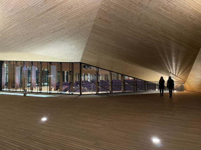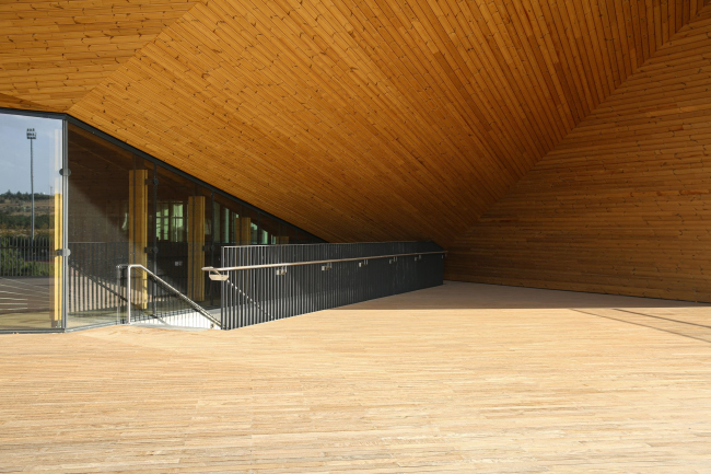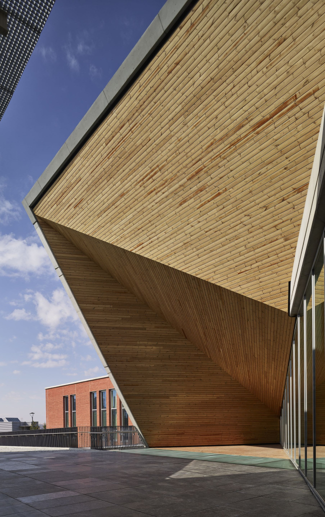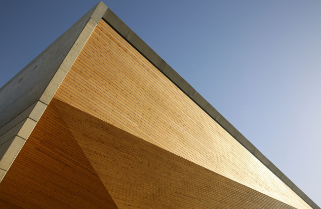 Торцевые фасады, напротив, решены радикально: многогранные обшитые деревом поверхности в сочетании с архитектурным бетоном и стеклом воплощают метафоры «глаза» и «объятий».